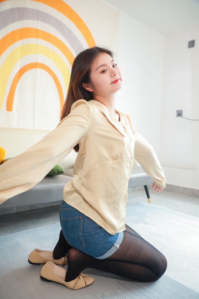 ❀服装:长袖衬衫  牛仔短裤 厚黑丝袜 黄色平底鞋