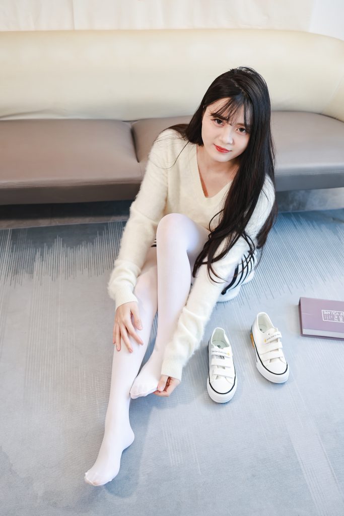 ❀服装:白色毛衣 厚白丝袜 黑白条纹短裤 白色板鞋
