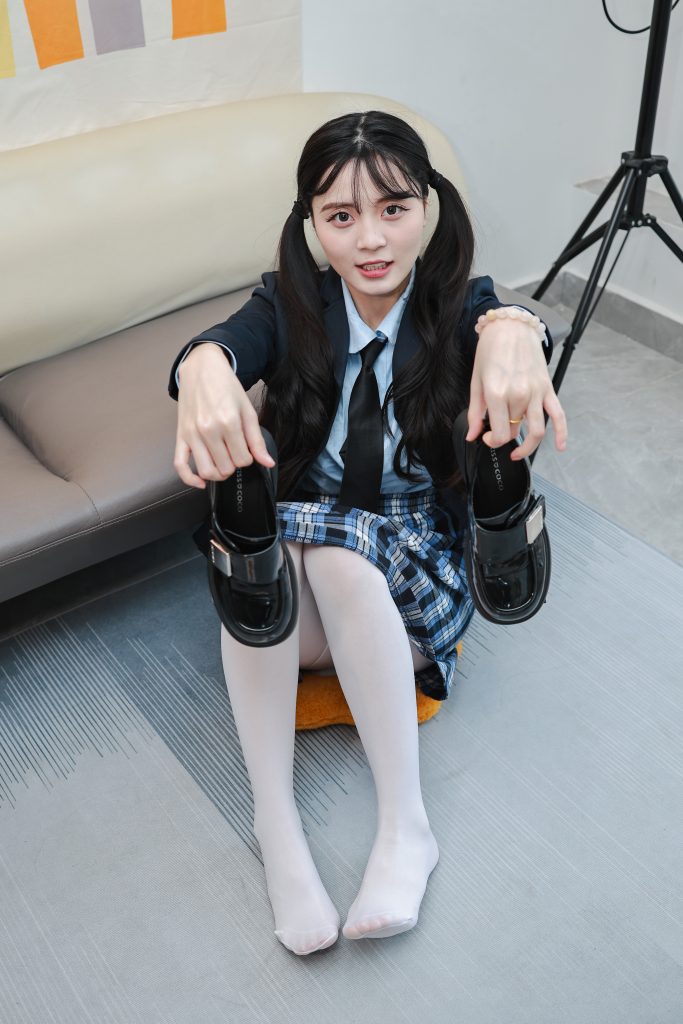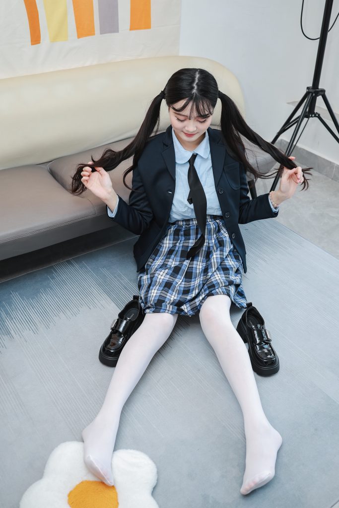 ❀服装:学院风  黑色西服 厚白丝袜  蓝格短裙 黑色小皮鞋